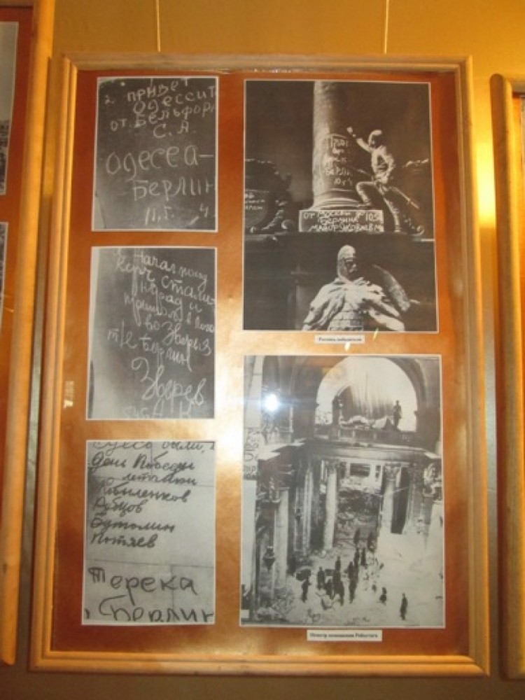 К 69-й годовщине Победы в Великой Отечественной войне в филиале Одесского историко-краеведческого музея «Мемориал героической обороны Одессы» открылась фотовыставка «Автографы Победы». На стендах представлены копии фотографий, иллюстрирующие наступательную операцию на Берлин, которая проводилась с 16 апреля по 8 мая 1945 года и стала кульминацией войны, пишет сайт города Одессы. «Помимо фотоснимков о военных днях и оккупации в Берлине, у нас в музее представлена копия Знамени Победы, которое 30 апреля 1945 года в 14 часов 25 минут водрузили над куполом рейхстага сержанты Берест, Егоров и Кантария. 2 мая командование Берлинского гарнизона капитулировало, свыше 300 тысяч немецких солдат и офицеров сдались в плен и Берлинская операция завершилась», — рассказала разработчик выставки, заведующая военно-историческим отделом музея Марина Прокофьева. Выставка создана из фотоматериалов фонда Одесского историко-краеведческого музея, фотоархива Мемориала и интернет-ресурсов.