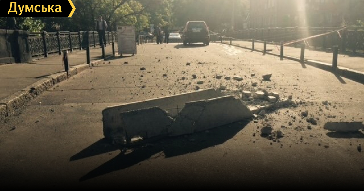 Щас все расскажу! Это случилось прямо у меня на глазах. Молодой парень, говорит просто не увидел блок из-за яркого солнца, бьющего прямо в глаза. Действительно, если в это время подниматься по Бунина в сторону Канатной солнце сильно слепит. Если еще лобовое стекло не очень чистое — вообще ничего не видно. Парень, видно давно тут не ездил, но зачем было гнать? Разбил сильно: переднего бампера нет, оторвало напрочь, радиатор пробил. Ругался сильно, что не оградили как следует.