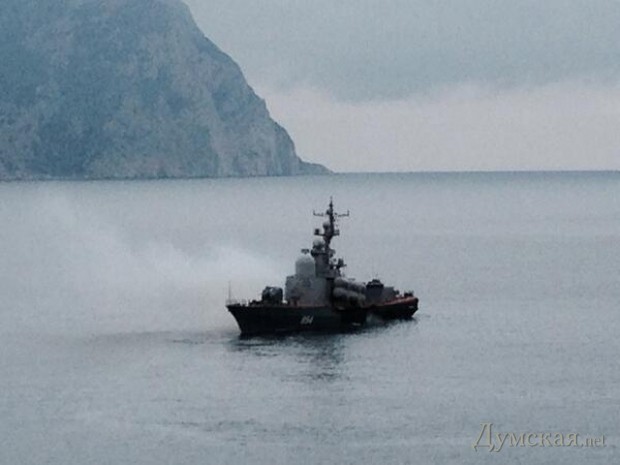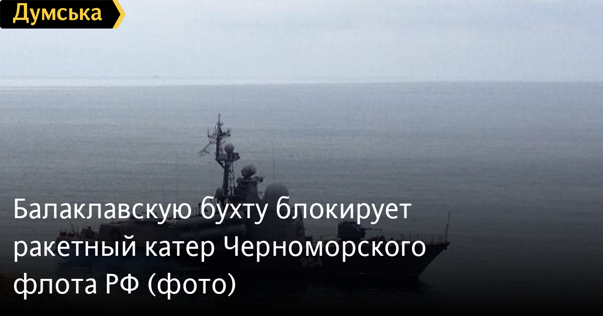Отметим, что, судя по фотографии, бухту блокирует не фрегат, а малый ракетный катер (по украинской терминологии — «корвет») проекта 12411М. Бортовой номер — 954. Такой носит катер Р-334 «Ивановец», входящий в 41-ю бригаду РК Черноморского флота РФ.