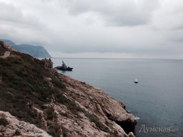 Военный корабль под Андреевским флагом заблокировал вход в Балаклавскую бухту, где базируются катера 5-го Севастопольского отряда морской охраны ГПСУ.