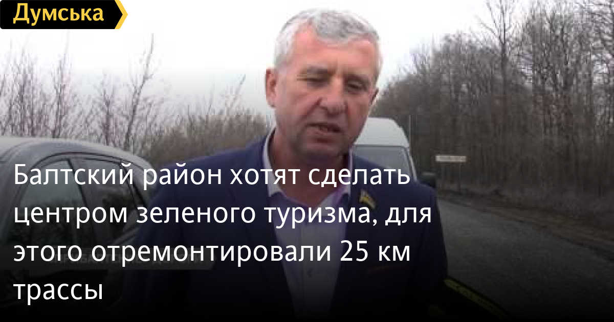 Балтский район хотят сделать центром зеленого туризма, для этого отремонтировали 25 км трассыБалтский район может стать центром зеленого туризма. Для этого у севера Одесской области есть потенциал, но нет инфраструктуры. Дороги на трассе Одесса-Балта не лучше, чем разрекламированная трасса Одесса-Рени СМЕРТЬ РОССИЙСКИМ ОККУПАНТАМ! Заметили ошибку? Выделяйте слова с ошибкой и нажимайте control-enter Думская ТВ. Сюжеты: