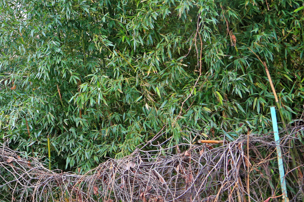 Одна такая «плантация» расположилась возле неприметной девятиэтажки на улице Ильфа и Петрова — это самая окраина Одессы. В качестве живой изгороди жильцы использовали виноградную лозу, за которой поднялась стена субтропического злака. Сразу видно, бамбук чувствует себя вполне комфортно.