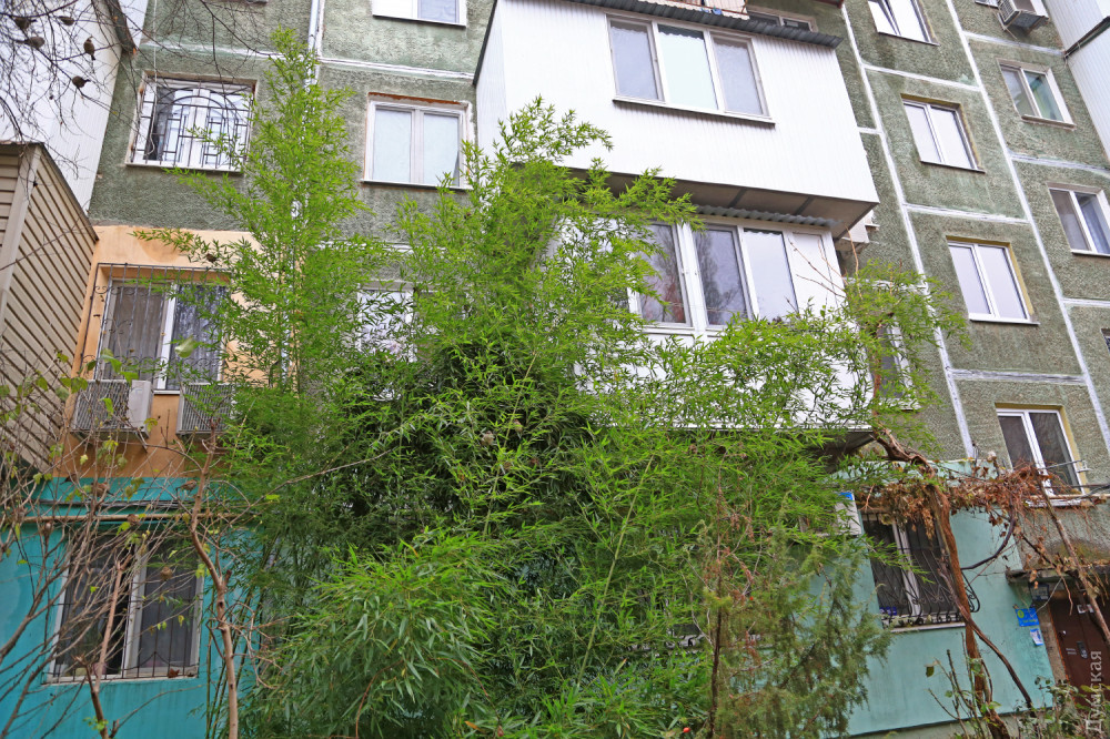 Еще одна локация — на Черемушках. Здесь растение тоже неплохо прижилось. Куст занимает примерно шесть квадратных метров, а в высоту уже вымахал 10 метров, достигнув уровня третьего этажа. Интересно, что даже сегодня, в середине декабря, он остается зеленым.