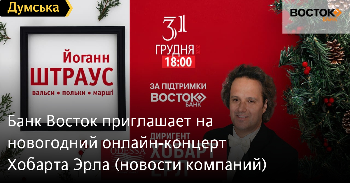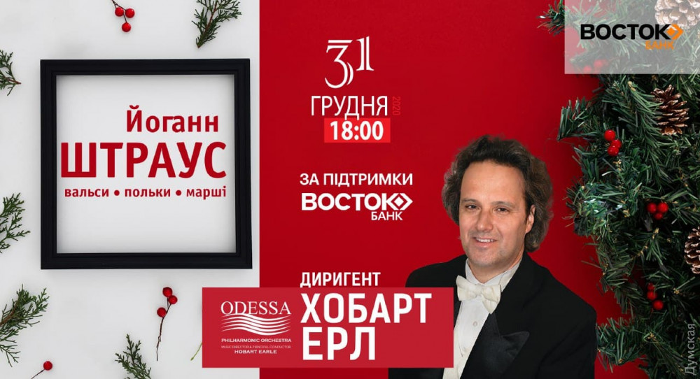 31 декабря Банк Восток дарит всем ценителям классической музыки возможность присоединиться к трансляции новогоднего концерта — оркестр одесской Филармонии и главный дирижер Хобарт Эрл будут исполнять музыку «короля вальсов» Иоганна Штрауса.
