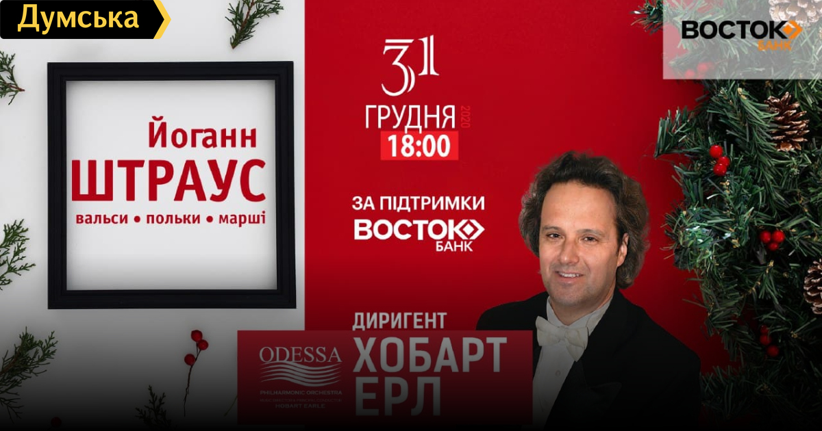 Банк Восток приглашает на новогодний онлайн-концерт Хобарта Эрла (новости компаний)31 декабря Банк Восток дарит всем ценителям классической музыки возможность присоединиться к трансляции новогоднего концерта — оркестр одесской Филармонии и главный дирижер Хобарт Эрл будут исполнять музыку «короля вальсов» Иоганна Штрауса. В течение 25 лет Национальный одесский филармонический оркестр и его руководитель Хобарт Эрл продолжают дарить одесситам и гостям города праздничное настроение своим мастерством. Маэстро Эрл учился и руководил организованным им Венским камерным оркестром, что позволило ему, в сотрудничестве с одесским оркестром, оживить очарование музыки Штрауса. «Банк Восток желает веселых праздников. Ощутите новогоднюю сказку вместе с оркестром, окунитесь в атмосферу Венского бала и подарите рождественское настроение себе и всей семье», — приглашают организаторы. Онлайн-трансляция концерта состоится 31 декабря в 18:00 на сайте Национального одесского филармонического оркестра, по ссылке https://odessaphil.org. СМЕРТЬ РОСІЙСЬКИМ ОКУПАНТАМ! Помітили помилку? Виділяйте слова з помилкою та натискайте control-enter