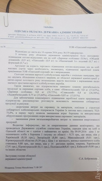 На этом фоне монополист обратился к областной администрации с просьбой разрешить повысить цены на хлеб. Дело было в августе. ОГА возразила, что оснований для подорожания нет, хотя у нас вроде как не социализм, и вопрос ценообразования вообще не в компетенции государственных органов. Могли бы и просто послать.