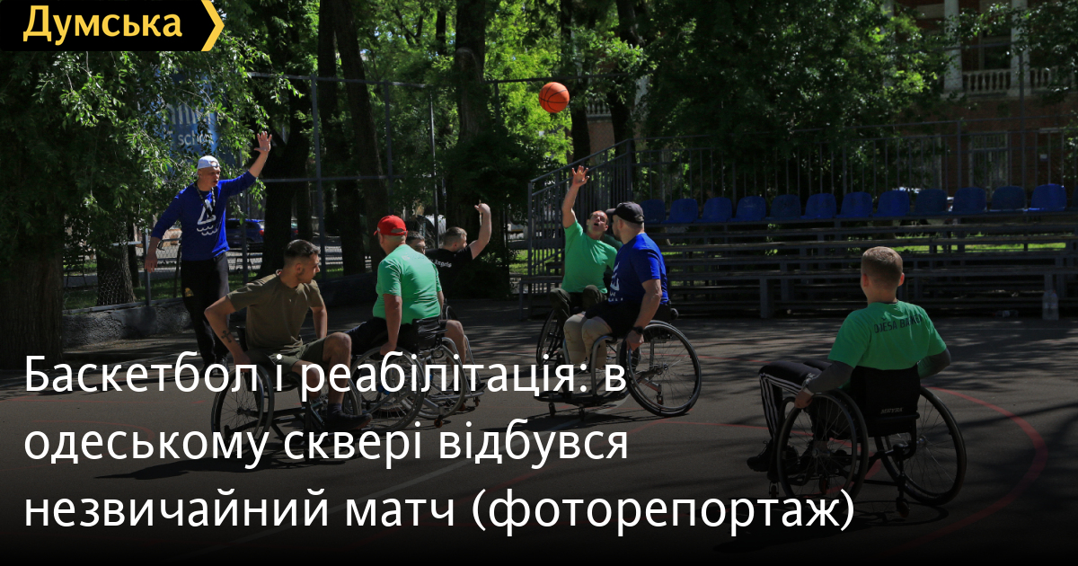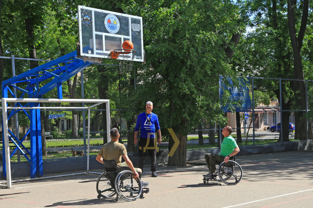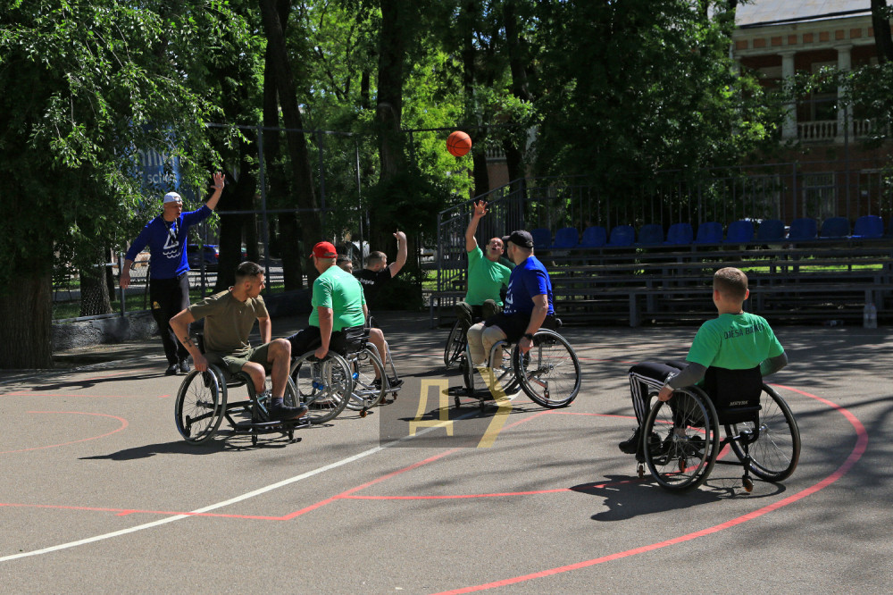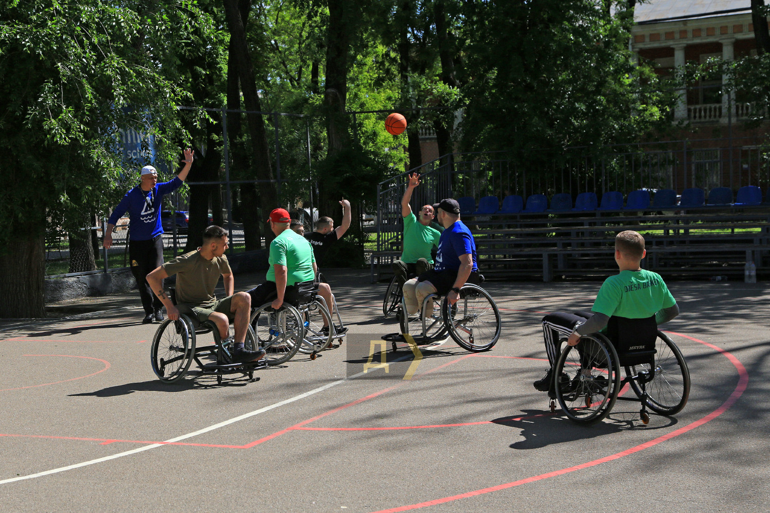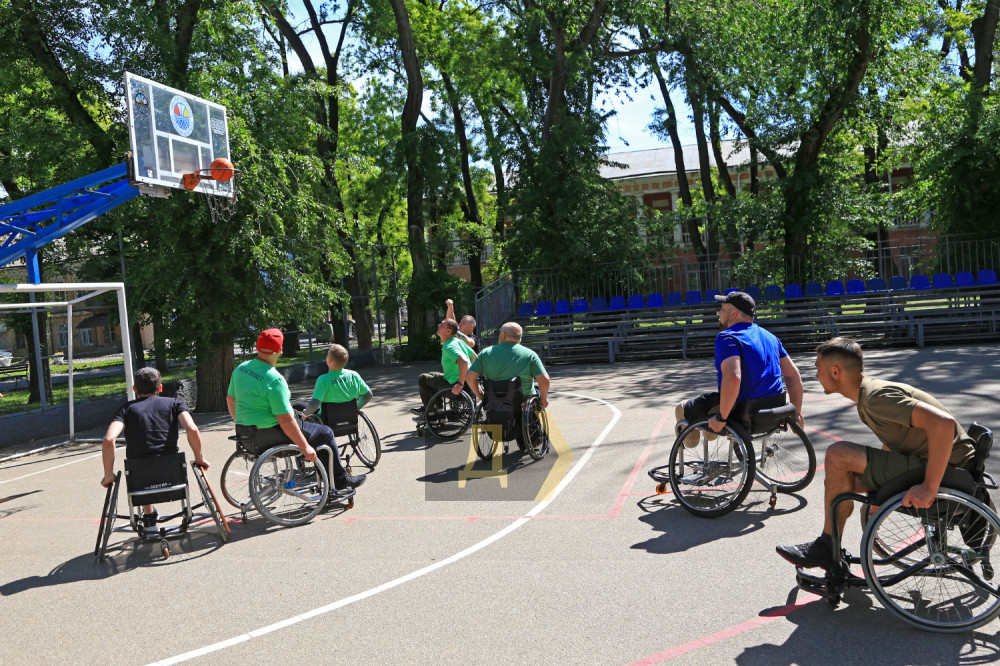 Незвичайний баскетбольний матч відбувся сьогодні на спортмайданчику в Старобазарному сквері. Змагалися дві команди українських воїнів, які зазнали важких поранень.