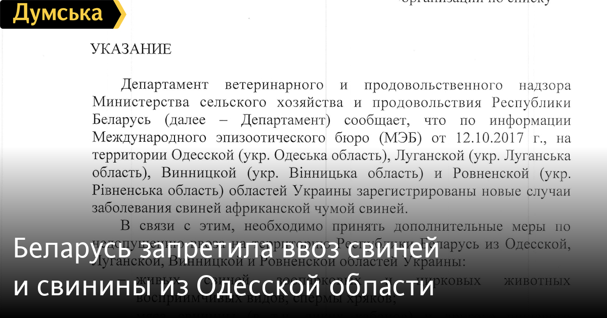 Республика Беларусь запретила ввоз свиней и свинины из Одесской, Луганской, Винницкой и Ровненской областей Украины. Связано это с новыми вспышками африканской чумы свиней, говорится в указании департамента ветеринарного и продовольственного надзора министерства сельского хозяйства РБ. Из перечисленных регионов Украины в Беларусь запрещено ввозить живых свиней, свинину (в том числе мясо диких кабанов), другую пищевую и непищевую продукцию свиноводческой отрасли, включая кожевенное сырье. СМЕРТЬ РОССИЙСКИМ ОККУПАНТАМ! Заметили ошибку? Выделяйте слова с ошибкой и нажимайте control-enter |