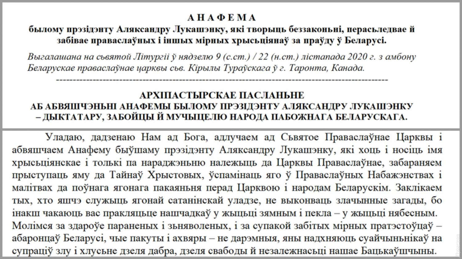 Беларусская автокефальная церковь предала анафеме Лукашенко и назвала его самозванцем и мучителем22 ноября глава Беларусской автокефальной православной церкви архиепископ Святослав Логин во время службы в соборе Святого Кирилла Туровского в канадском городе Торонто зачитал послание, в котором говорится, что Александр Лукашенко предан анафеме, Как сообщает беларусская служба Радио Свобода, отец Святослав назвал Лукашенко «бывшим президентом Беларуси», «самозванцем», «диктатором» и «мучителем беларусского народа». В обращении говорится, что архиепископ и священники церкви молятся «за здоровье раненых и заключенных и за покой убитых мирных протестующих – защитников Беларуси, чьи страдания и жертвы – не напрасны, они вдохновляют соотечественников на сопротивление злу и лжи ради добра, ради свободы и независимости нашего отечества». Беларусская автокефальная православная церковь – это религиозная организация беларусов, не признается поместными православными церквями. Имеет приходы в США, Канаде, Австралии, Великобритании, Беларуси. Богослужения ведутся на белорусском языке. Церковь также занимается культурно-просветительской, общественной, благотворительной деятельностью, помогает сохранить духовное наследие беларусов. СМЕРТЬ РОССИЙСКИМ ОККУПАНТАМ! Заметили ошибку? Выделяйте слова с ошибкой и нажимайте control-enter |