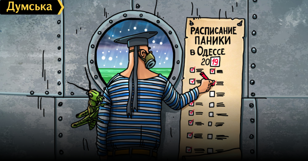 Одесские СМИ любят выпускать новости под заголовками типа «Одесситов напугало ». Если верить коллегам, наши земляки — люди, весьма склонные к панике. По ночам горожанам не дают спать неопознанные летающие объекты и загадочные взрывы, которые чаще всего только слышны и остаются без последствий (настоящие теракты, увы, тоже случаются, но реже), а днем — аномальные природные явления и конденсационные следы от самолетов, которые, как всем известно, не следы вовсе, а распыляемая властями отрава. Пик панических сообщений и слухов приходится обычно на лето, когда всякие «аномалии» идут косяком. И этот июнь не стал исключением. Более того, сейчас одесситы пугаются сильнее обычного. И в самом деле, как тут не ужаснуться? Море цветет и воняет на весь центр то ли тухлыми яйцами, то ли разлагающимися трупами, кузнечики расплодились (ужас-ужас, саранча!), а местами еще и град выпал Никогда такого не было, и вот опять. Карикатуристы «Думской» Александр Бронзов и Игорь Жеведь посвятили локальному концу света в Одессе свою очередную работу. СМЕРТЬ РОСІЙСЬКИМ ОКУПАНТАМ! Помітили помилку? Виділяйте слова з помилкою та натискайте control-enter Новини по цій темі: 23 грудня 2021: Бумеранг: коротко о подозрении Порошенко (карикатура) 24 вересня 2021: Олигархам брошен вызов! (карикатура) 2 червня 2021: "Зеленские деревни" (карикатура) 9 квітня 2021: Бутылочный арт: "Оттакої!" (карикатура) 23 лютого 2021: Одесские пробки: выход есть! (карикатура) 6 листопада 2020: И еще о результатах выборов в Одессе: "Она утонула" (карикатура") |