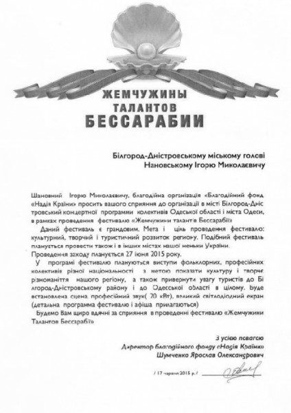 В субботу, 27 июня, в Белгороде-Днестровском планируется проведение фестиваля «Жемчужины талантов Бессарабии». Организаторы акции обратились к городскому голове Белгорода-Днестровского Игорю Нановскому с просьбой оказать содействие в проведении фестиваля.