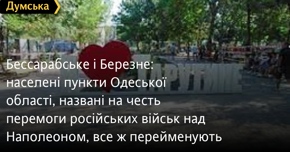 Бессарабське і Березне: населені пункти Одеської області, названі на честь перемоги російських військ над Наполеоном, все ж перейменуютьВаріанти нових назв для населених пунктів Тарутинської громади, які підлягають перейменуванню в рамках закону про деколонізацію, направила Верховній Раді селищна рада. Пропозиції, отримані від жителів і комісії з перейменування, затвердили на сесії селищної ради 16 січня. Так, для селища Тарутине пропонують назву Бессарабське, а Березине буде називатися Березне. Село Малоярославець Перший хочуть перейменувати на Прикордонне, а Малоярославець Другий — на Ярославець на честь князя Ярослава Мудрого. Нагадаємо, 14 грудня Тарутинська селищна рада звернулася до Українського інституту національної пам'яті (УІНП) із проханням вилучити Тарутине та Березине зі списку населених пунктів, які необхідно перейменувати в рамках закону про деколонізацію. УІНП написав офіційну відповідь, у якій ідеться про те, що селища мають бути перейменовані, оскільки їхні назви пов'язані з історією російської імперії. Селища Тарутине і Березине, а також села Малоярославець Перший і Другий розташовані в Болградському районі Одеської області та входять до складу Тарутинської громади. Населені пункти засновані німецькими колоністами. Тарутине — 1814 року, селище отримало свою теперішню назву на честь переможного наступу російської армії проти французів, що розпочався в жовтні 1812 року від села Тарутине Угодсько-Заводського повіту Калузької губернії. Березине заснували 1816-го і назвали на честь перемоги російських військ над французами, що відступали, у битві на річці Березині на території сучасної Білорусі. Село Малоярославець Перший заснували 1814 року 138 родин із Вюртемберга. Отримало свою назву на честь перемоги російської армії під Малоярославцем 1812 року. Малоярославець Другий заснований німецькими колоністами 1817-го і відомий також під назвою Боршталь. СМЕРТЬ РОСІЙСЬКИМ ОКУПАНТАМ! Помітили помилку? Виділяйте слова з помилкою та натискайте control-enter |