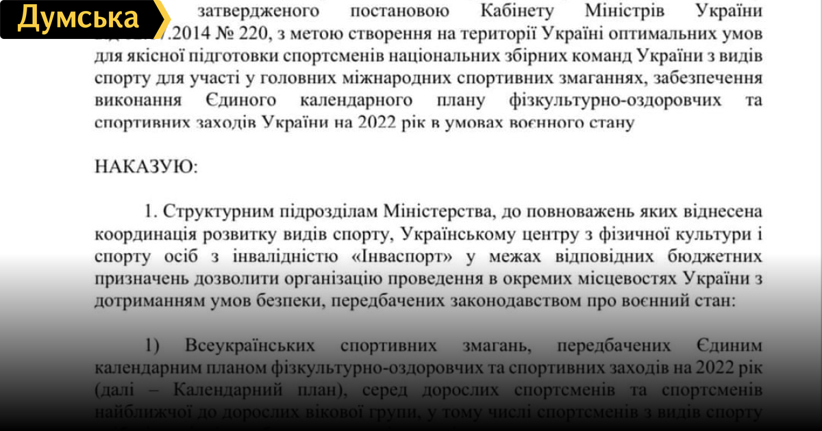 В Министерстве молодежи и спорта приняли решение снять запрет на проведение всеукраинских спортивных соревнований. Об этом сообщил народный депутат Жан Беленюк, опубликовав соответствующий приказ министерства от 28 мая. Нардеп сообщил, что соревнования будут разрешены в отдельных регионах Украины, без уточнения в каких именно. Согласно документу, соревнования будут проходить без зрителей и при соблюдении условий безопасности, предусмотренных законодательством о военном положении. Уточняется, что возобновляются только состязания среди взрослых категорий спортсменов, в том числе и спортсменов с инвалидностью. Также, разрешено проведение учебно-тренировочных сборов национальных сборных команд Украины. СМЕРТЬ РОСІЙСЬКИМ ОКУПАНТАМ! Помітили помилку? Виділяйте слова з помилкою та натискайте control-enter |