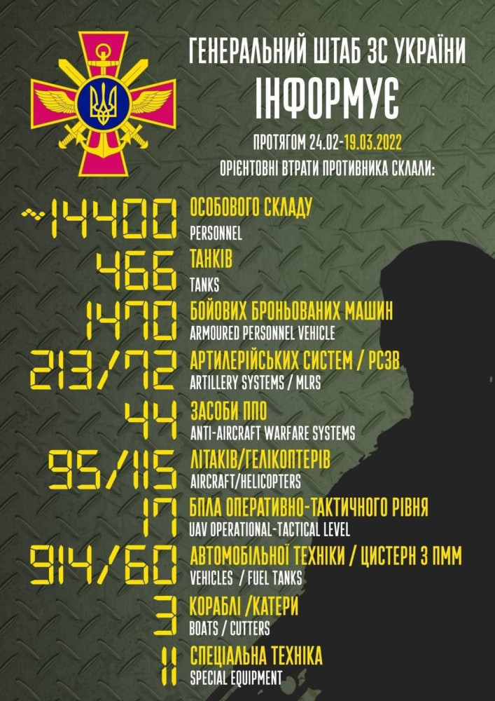 Как сообщают в Генеральном штабе ВС Украины, с первого дня войны враг потерял около 14400 единиц личного состава.