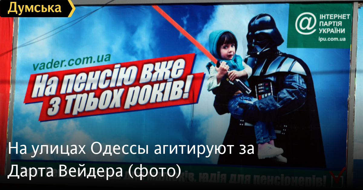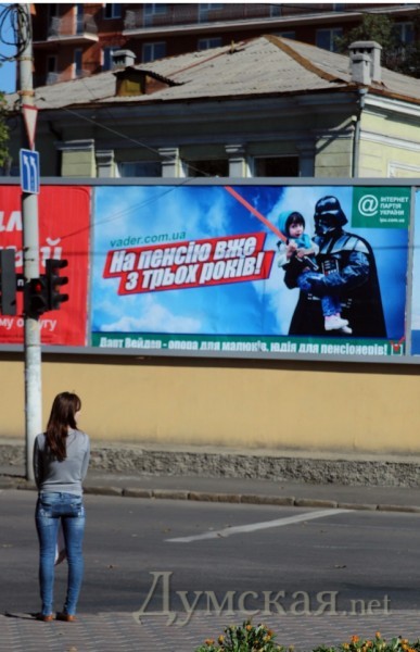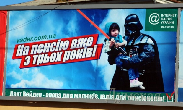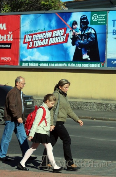 Возле одесского кинотеатра «Родина» разместили билборд с предвыборной агитацией Дарта Вейдера, где он изображен с ребенком на руках.