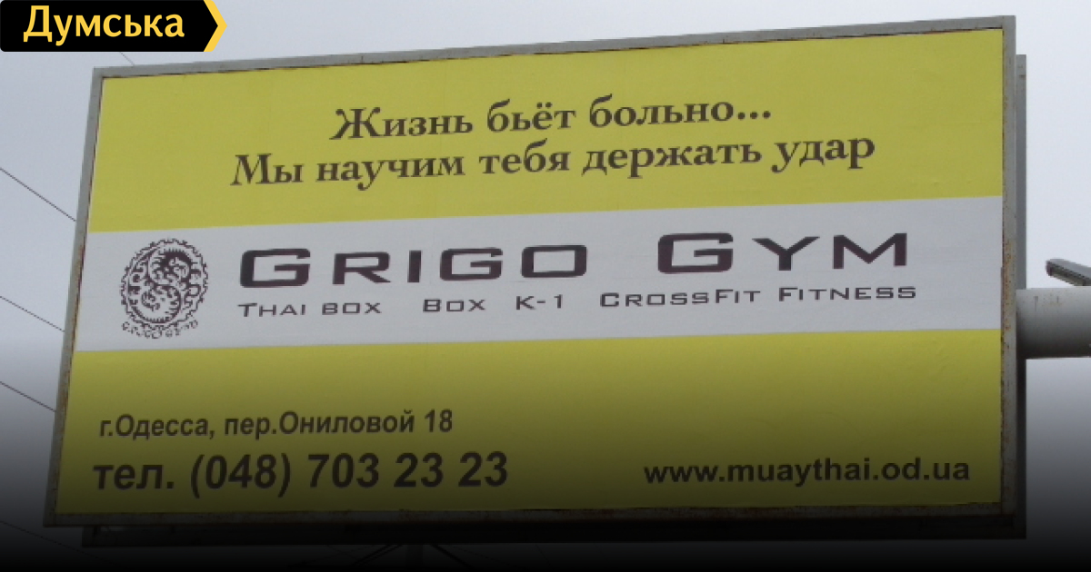 Билборды «Жизнь бьет…» оказались рекламой одесского спортклуба (новости компаний)На месте билбордов с надписью «Жизнь бьет больно», недавно замеченных на улицах Одессы, появилось продолжение фразы. «Мы научим тебя держать удар», — гласит слоган. Таким способом свои услуги предложил Спортивный клуб Grigo GYM, у которого скоро открывается новый зал. СМЕРТЬ РОСІЙСЬКИМ ОКУПАНТАМ! Помітили помилку? Виділяйте слова з помилкою та натискайте control-enter |
