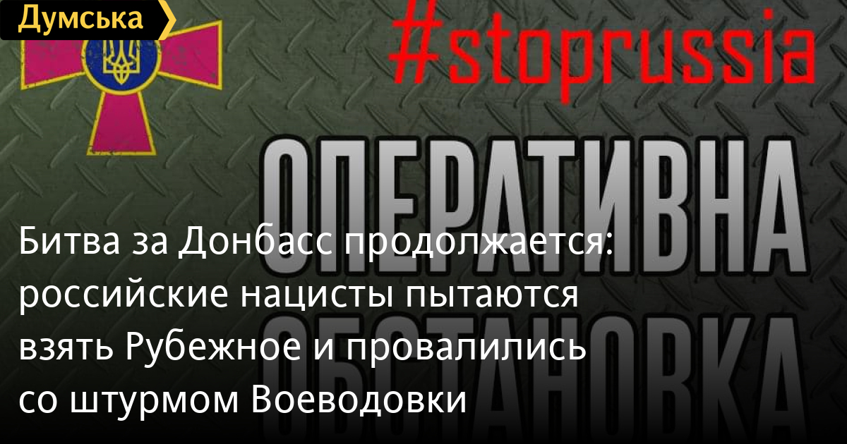 На северодонецком направлении идет бой за Рубежное. Противник пытается улучшить тактическое положение, овладеть городом и создать благоприятные условия для дальнейшего развития наступательных действий в направлении Лимана и Северодонецка. Российские нацисты тщетно пытались штурмовать Воевдовоку. Отошли на ранее занятые позиции.