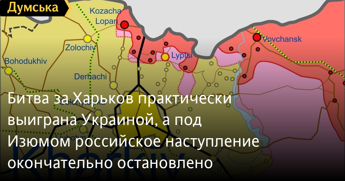 По данным «Думской», битва за Харьков, которая длилась с первого дня полномасштабного российского вторжения, практически завершилась и в пользу наших Сил обороны.
