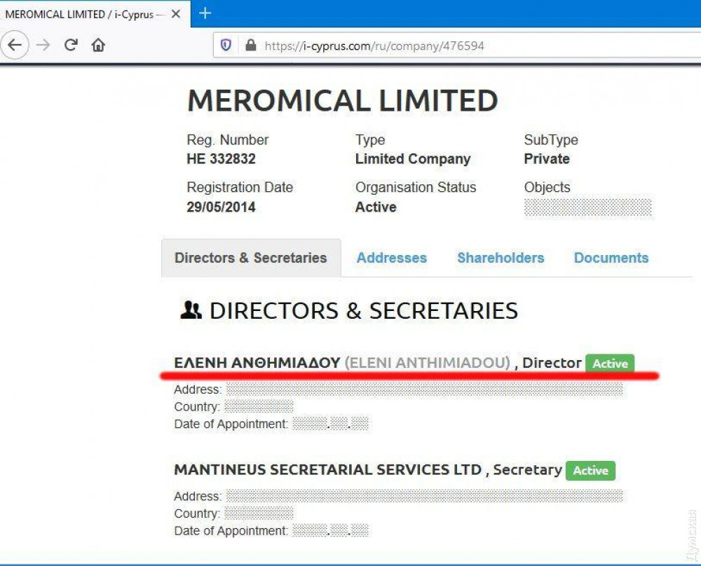 Согласно документам, Элени Антимиаду является директором Meromical ltd. Эта фирма является соучредителем ряда других предприятий — например, АО «Балаклавское РУ».