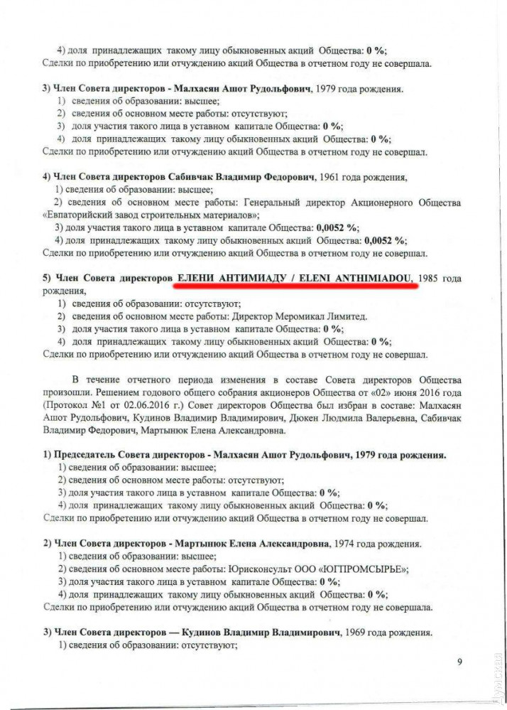 Так, в годовом отчете за 2016 год АО «Евпаторийский завод строительных материалов» в качестве одного из членов совета директоров значится конечный бенефициар «Бессарабского медиа-холдинга» Элени Антимиаду, проживающая на Кипре.