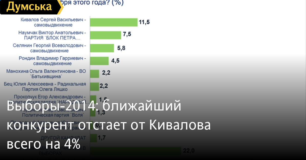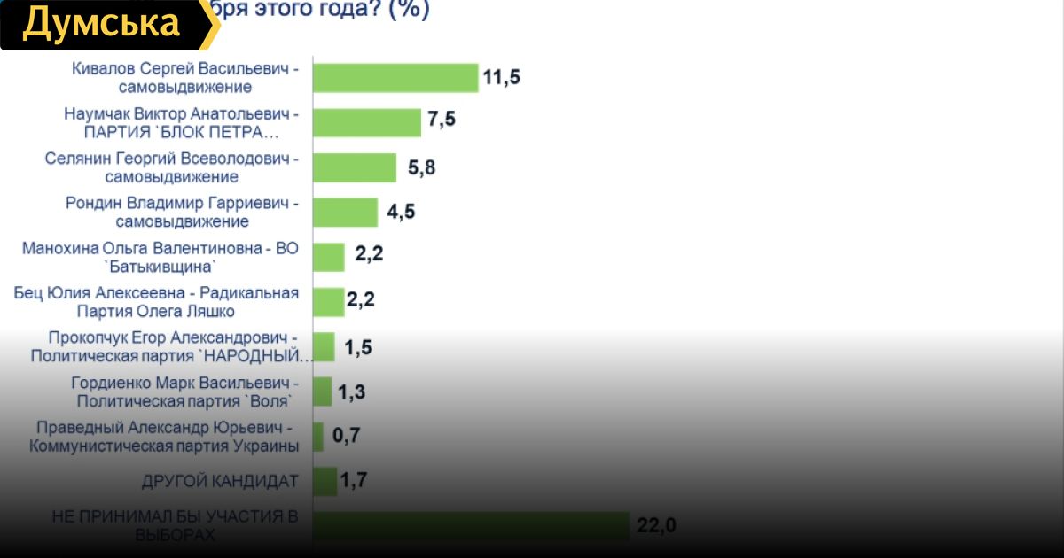 Лидирует пока Кивалов. Его готовы поддержать 11,5% опрошенных. Вторым оказался кандидат от Блока Петра Порошенко, депутат городского совета и директор одесского предприятия по производству тканей Виктор Наумчак — за него 7,5%. У Георгия Селянина — 5,8%, у Владимира Рондина — 4,5%. Активист одесского Евромайдана Марк Гордиенко может рассчитывать на 1,3%.