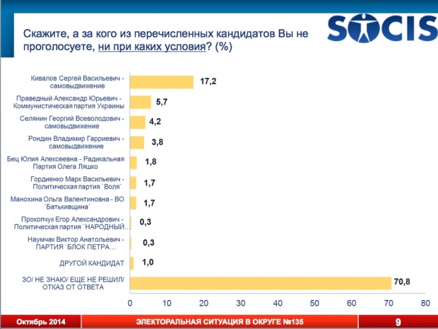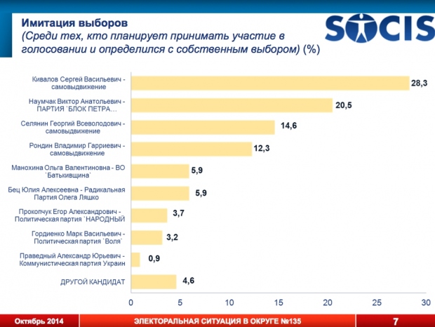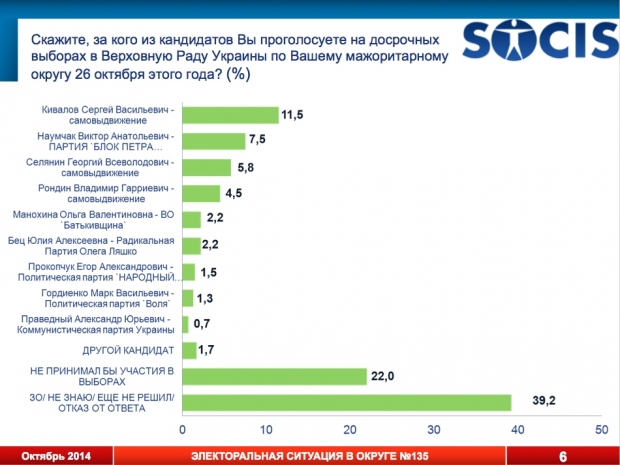 Центр социальных и маркетинговых исследований «Социс» провел исследование предвыборной ситуации в 135-ом округе (Приморский район Одессы). Из известных политиков там выставили свои кандидатуры нардеп Сергей Кивалов и депутаты горсовета Виктор Наумчак, Владимир Рондин и Георгий Селянин.
