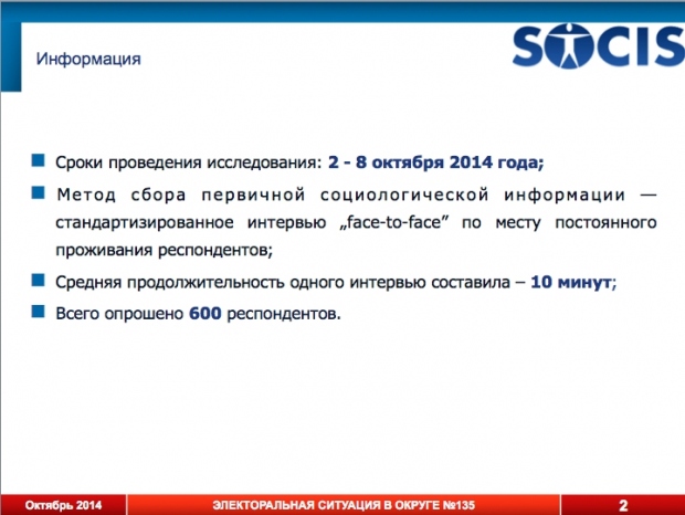 Опрос был проведен с 2 по 8 октября, по квотной репрезентативной выборке 600 жителей округа, имеющих право голоса.
