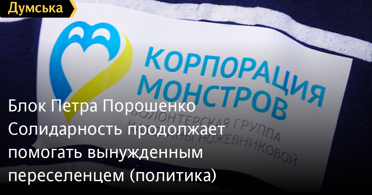 Как сообщили в пресс-службе партии, в БПП «Солидарность» постоянно действует программа помощи людям, которые были вынуждены переехать с востока страны. Так, недавно сумму в 10 700 гривен партийцы перечислили волонтерам из группы «Корпорация монстров» Екатерины Ножевниковой, которая закупает необходимые одесским переселенцам продукты и вещи, а потом выдает их по адресу Канатная, 35.