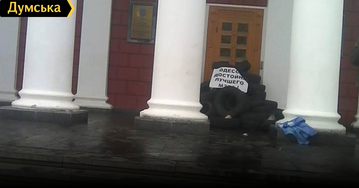 Сегодня утром чиновники одесской мэрии не смогли попасть на свои рабочие места: протестующие на Думской площади заблокировали шинами все три входа в здание.