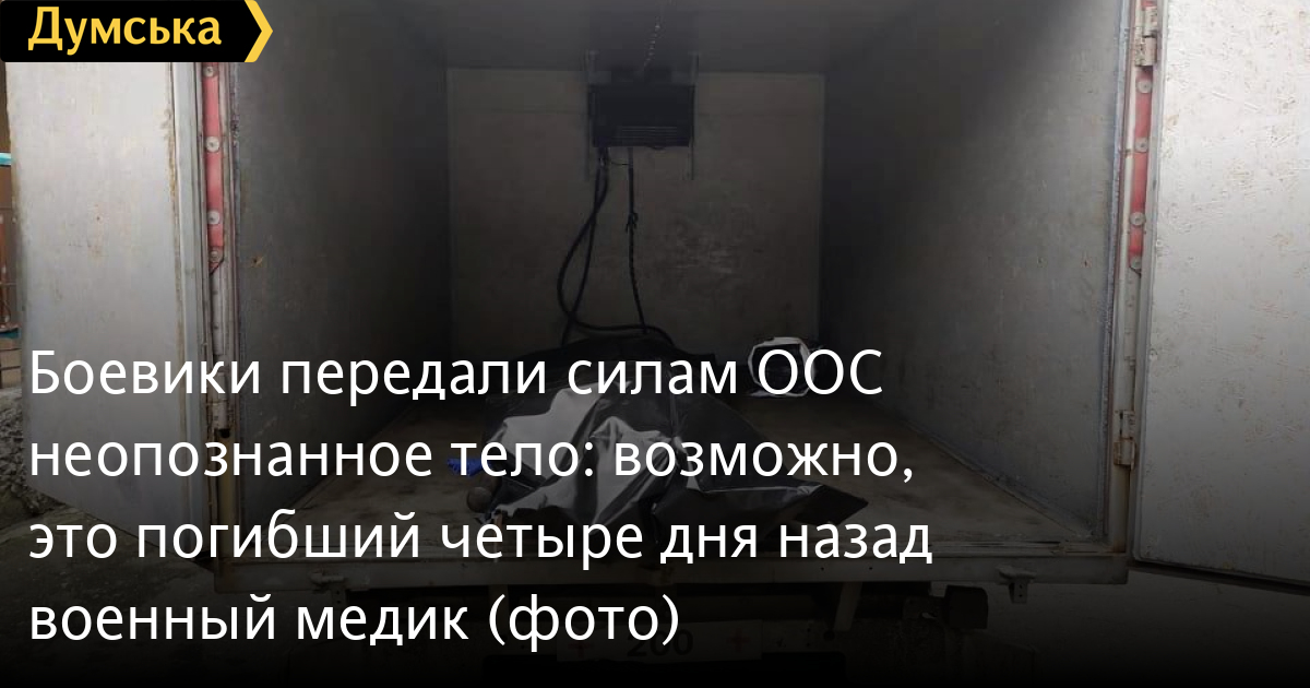 Российские оккупанты в 13:00 передали украинским бойцам на пункте пропуска «Марьинка» в Донецкой области неопознанный труп. Возможно, это тело военного медика, который погиб 13 июля во время атаки боевиков из засады вблизи позиций одесской 35-й отдельной бригады морской пехоты.