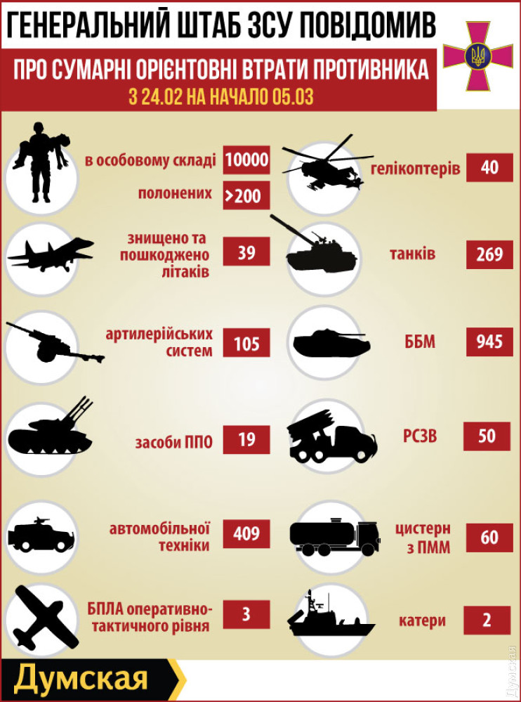 Более десяти тысяч человек убитыми и пленными, 269 танков и почти тысячу бронированных боевых машин потеряли рашисты в Украине с начала вторженияС 24.02 по 05.03 враг потерял несколько тысяч единиц техники. Около десяти тысяч оккупантов убиты или сдались в плен. За девять дней полномасштабного вторжения в Украину оккупанты потеряли 269 танков и 945 боевых бронемашин, 50 реактивных систем залпового огня и 19 средств ПВО, 39 самолетов и 40 вертолетов, 409 авто разных видов и 60 цистерн с топливом, три дрона оперативно-тактического уровня и два легких катера, сообщили в Генштабе. Более 10 тысяч рашистов убиты, ранены или сдались в плен. Данные уточняются. Подсчет усложняется высокой интенсивностью боевых действий. СМЕРТЬ РОССИЙСКИМ ОККУПАНТАМ! Заметили ошибку? Выделяйте слова с ошибкой и нажимайте control-enter |