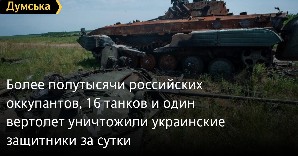Более полутысячи российских оккупантов, 16 танков и один вертолет уничтожили украинские защитники за сутки580 российских оккупантов ликвидировали Силы обороны Украины 9 августа. Общие потери противника с начала полномасштабного вторжения составляют 252 тысячи 200 солдат и офицеров. Как сообщили в Генеральном штабе Вооруженных сил Украины, за минувшие сутки наши защитники уничтожили 16 танков (4278 за все время), 13 боевых бронированных машин (всего 8303), 15 артиллерийских систем (5028), 16 грузовиков и автоцистерн (7495), четыре единицы спецтехники (746). Кроме этого, силы противовоздушной обороны сбили один вертолет (всего 313) и четыре беспилотника оперативно-тактического уровня. Последних уничтожено уже 4179. СМЕРТЬ РОССИЙСКИМ ОККУПАНТАМ! Заметили ошибку? Выделяйте слова с ошибкой и нажимайте control-enter |