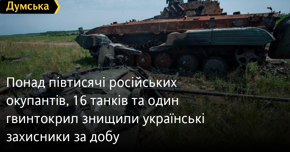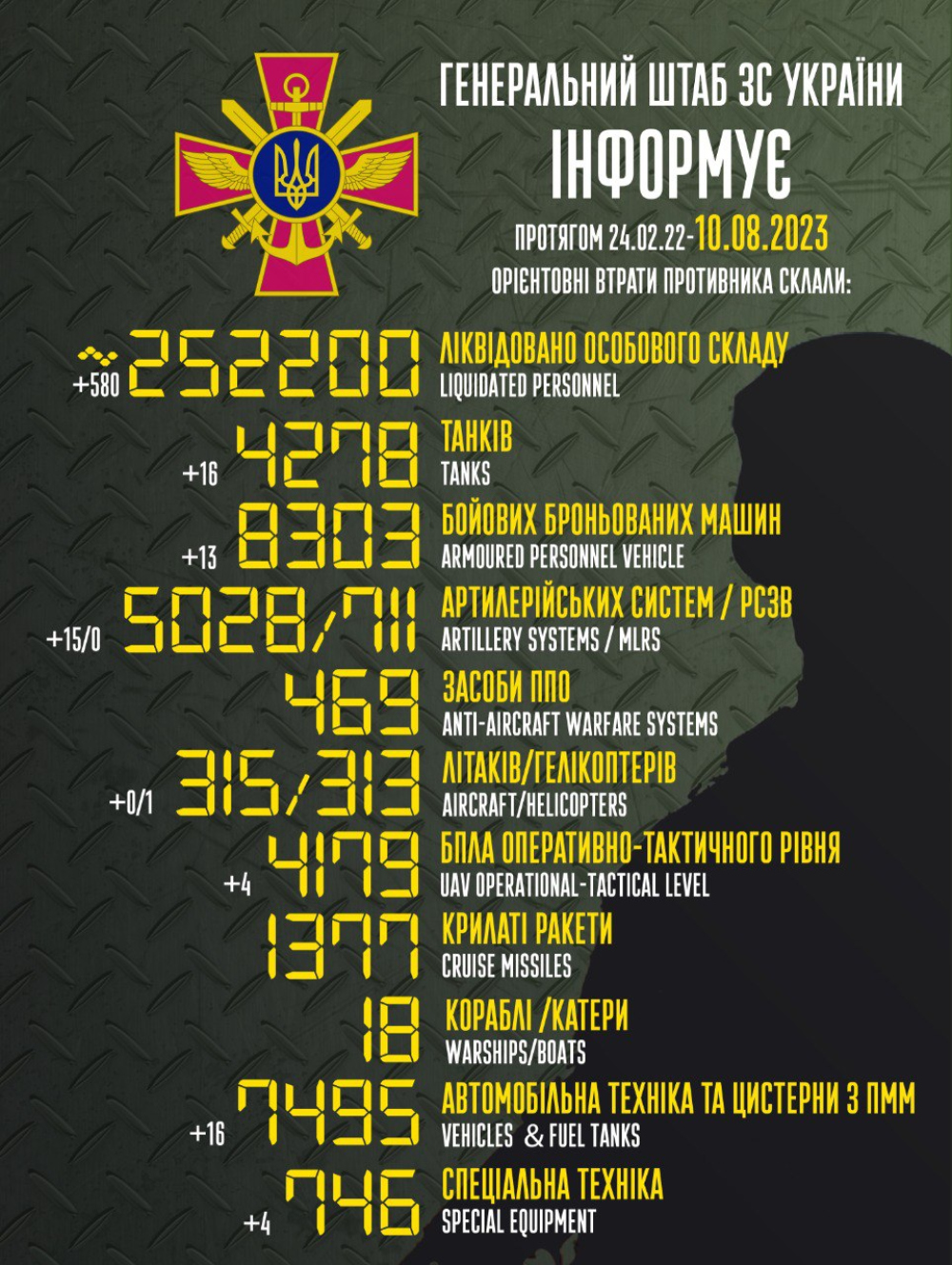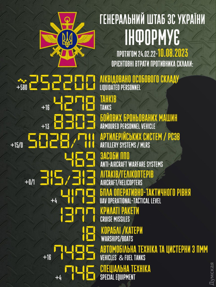 Понад півтисячі російських окупантів, 16 танків та один гвинтокрил знищили українські захисники за добу580 російських окупантів ліквідували Сили оборони України 9 серпня. Загальні втрати противника з початку повномасштабного вторгнення складають 252 тисячі 200 солдатів і офіцерів. Як повідомили у Генеральному штабі Збройних сил України, за минулу добу наші захисники знищили 16 танків (4278 за весь час), 13 бойових броньованих машин (всього 8303), 15 артилерійських систем (5028), 16 вантажівок та автоцистерн (7495), чотири одиниці спецтехніки (746). Крім цього, сили протиповітряної оборони збили один гелікоптер (всього 313) і чотири безпілотники оперативно-тактичного рівня. Останніх знищено вже 4179. СМЕРТЬ РОСІЙСЬКИМ ОКУПАНТАМ! Помітили помилку? Виділяйте слова з помилкою та натискайте control-enter |