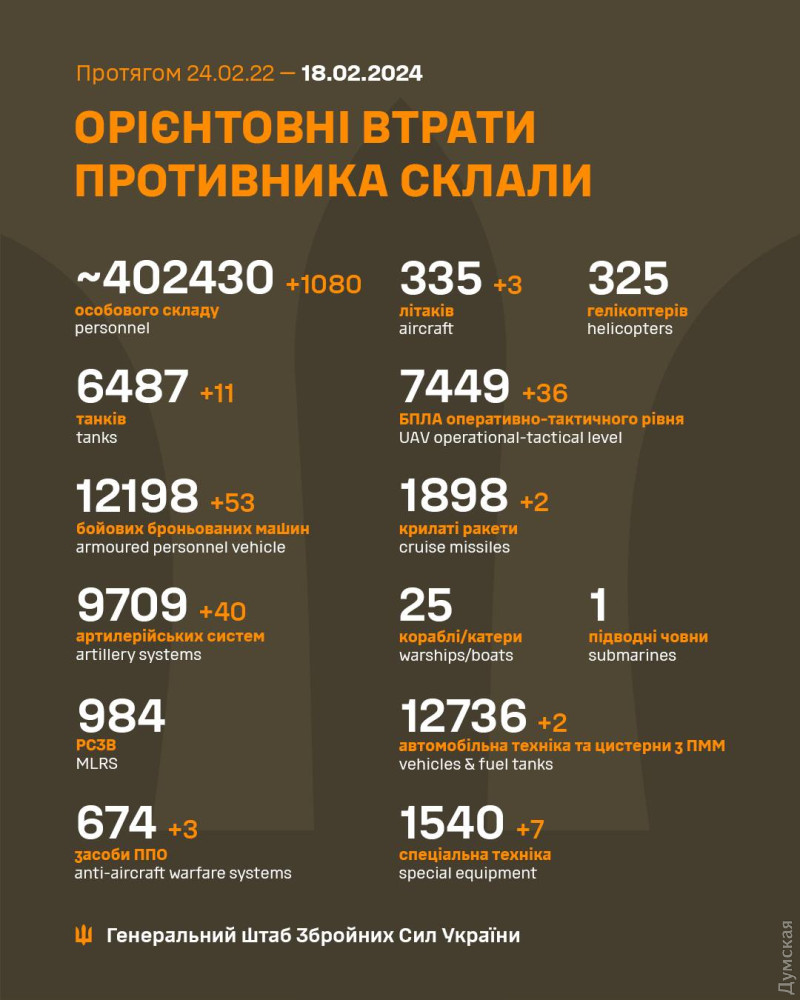 Понад тисячу окупантів, 53 бронемашини та 40 артилерійських систем знищили Сили оборони за добуЩе 1080 російських загарбників полягли в Україні 17 лютого. Загальні втрати ворожої армії з початку повномасштабної війни — 402 тисячі 430 солдатів і офіцерів. За даними Генерального штабу Збройних сил України, також учора наші захисники спалили 11 російських танків (6487 за весь час), 53 бойові броньовані машини (12198), 40 артилерійських систем (9709). Знищено три установки ППО противника (674), дві вантажівки (12736), сім одиниць спецтехніки (1540). Збито три літаки (335), 36 дронів оперативно-тактичного рівня (7449), дві крилаті ракети (1898). СМЕРТЬ РОСІЙСЬКИМ ОКУПАНТАМ! Помітили помилку? Виділяйте слова з помилкою та натискайте control-enter |