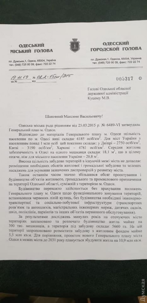 Согласно нему, горсовету предлагают обратиться к губернатору Максиму Куцему с просьбой «учесть при разработке перспективного плана формирования территорий громад Одесской области перспективы развития Одессы как областного центра в соответствии с его генеральным планом».