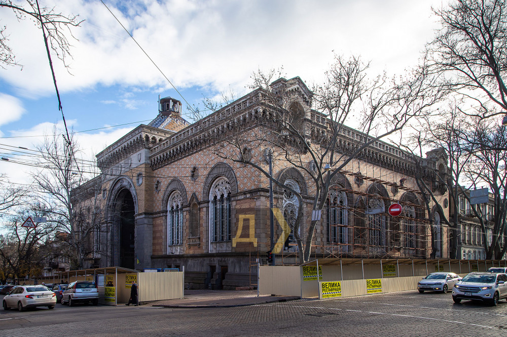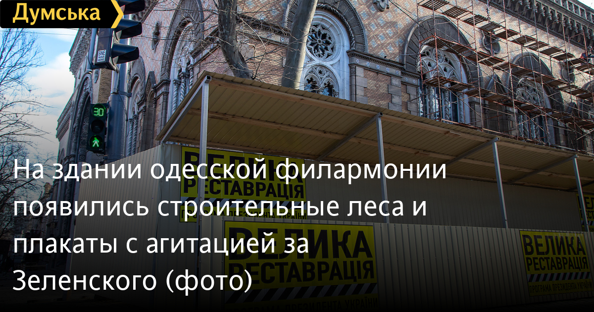 На памятнике архитектуры национального значения — здании Новой биржи, в котором размещается Одесская областная филармония, появились строительные леса и большие плакаты, которые информируют, что реставрация объекта ведется в рамках соответствующей президентской программы.