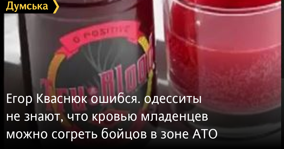Егор Кваснюк ошибся. одесситы не знают, что кровью младенцев можно согреть бойцов в зоне АТООтец Егора Кваснюка может гордиться сыном. После того, как Кваснюк-младший в эфире российского телеканала поведал о том, что бойцы в зоне АТО греются кровью русских младенцев – Думская TV собрала более литра целебного напитка. СМЕРТЬ РОССИЙСКИМ ОККУПАНТАМ! Заметили ошибку? Выделяйте слова с ошибкой и нажимайте control-enter Думская ТВ. Сюжеты:
