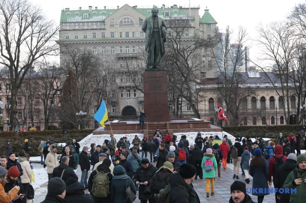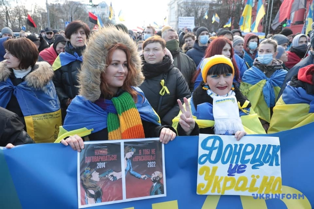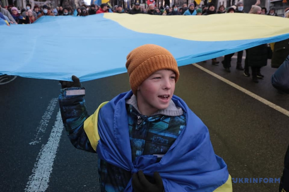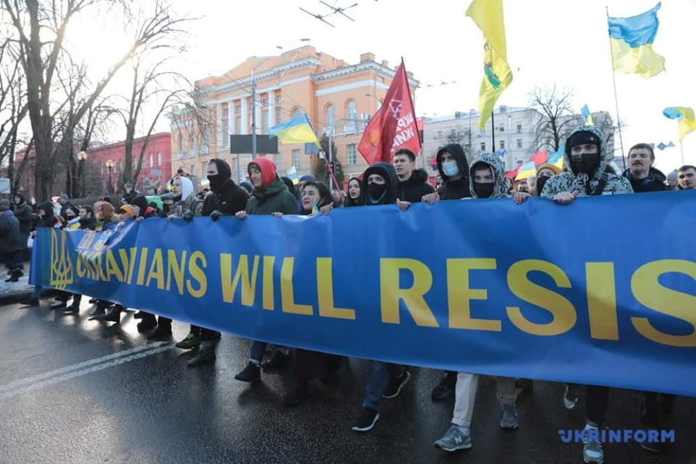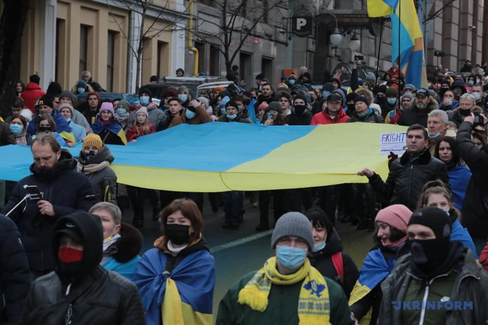 Как сообщает агентство «Укринформ», участники акции прошагали от бульвара Шевченко до Крещатика и призвали украинцев забыть политические разногласия, объединиться и выступить вместе против российской угрозы.
