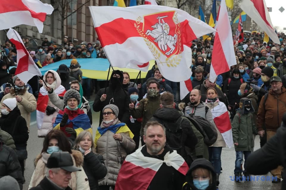 Участники марша несли украинские и белорусские флаги, плакаты с надписями «Say NO to PUTIN», «UKRAINIANS WILL RESIST» и «Донецк – это Украина».