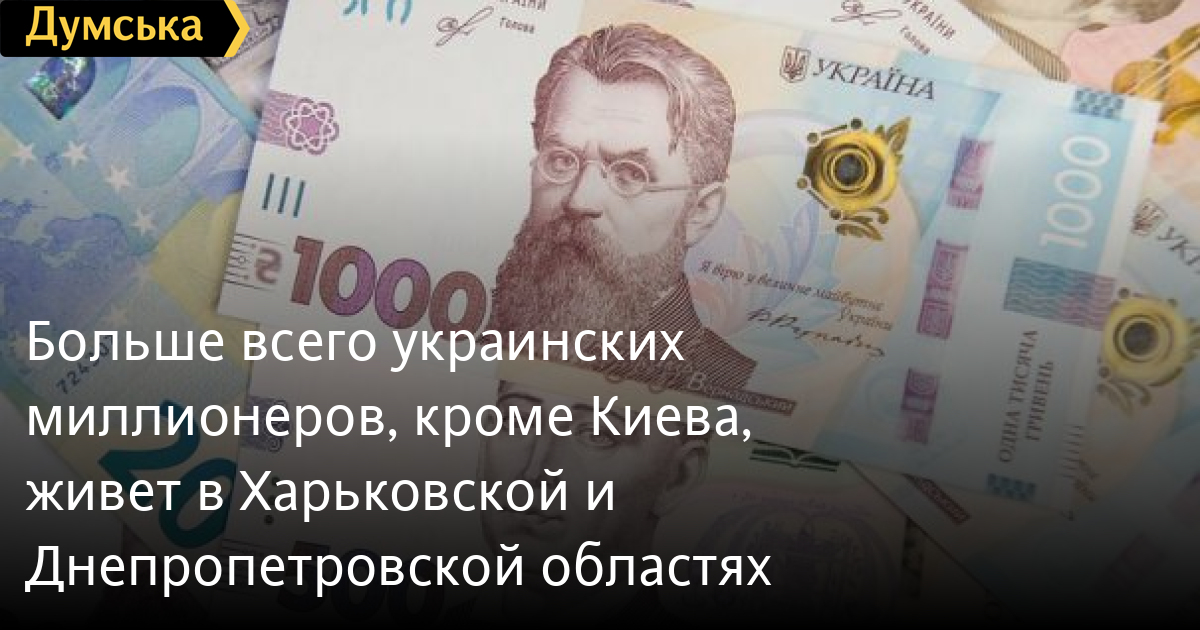 Больше всего украинских миллионеров, кроме Киева, живет в Харьковской и Днепропетровской областяхВ Украине по состоянию на 1 апреля 2020 года доходы свыше одного миллиона гривен за 2019 год задекларировали 1 тысяча 761 человек. Об этом сообщает Государственная налоговая служба Украины. В налоговой отметили, что доходы, превышающие один миллион гривен, чаще всего декларировали жители Киева (702 человека), Харьковской (143 человека), Днепропетровской (129 человек) и Киевской (103 человека) областей. Данные граждане обязаны будут заплатить налоги в бюджет в размере 234,4 млн грн. «Наибольшая сумма к уплате в бюджет в размере 24,9 млн грн (21,4 млн грн НДФЛ и 3,5 млн грн военного сбора) определена жителем Львовской области от получения иностранных доходов», — подчеркнули в налоговой службе. СМЕРТЬ РОССИЙСКИМ ОККУПАНТАМ! Заметили ошибку? Выделяйте слова с ошибкой и нажимайте control-enter |