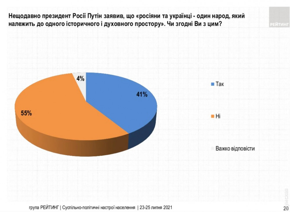 55% опрошенных не согласились с недавним заявлением лидера страны-агрессора, что «русские и украинцы — один народ, который относится к одному историческому и духовному пространству».