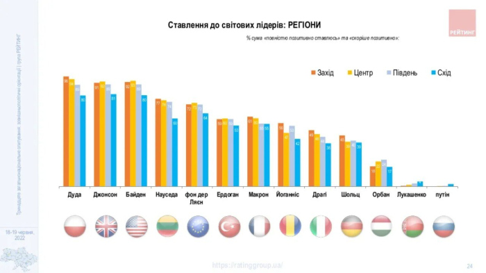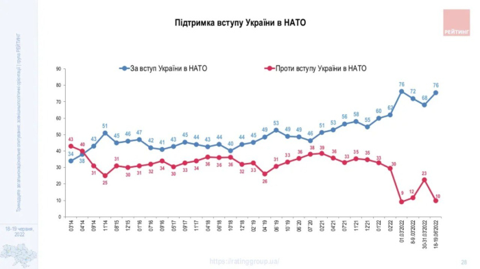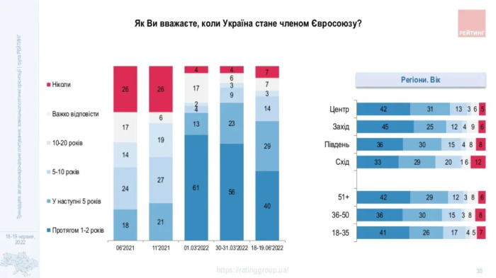 Большинство украинцев верит в победу через полгода-год, вступление в ЕС - за год-два и стремится в НАТО, — результаты опроса «Рейтинга»Социологическая группа «Рейтинг» узнала о мнении украинцев о сроках окончания войны, вступления в ЕС и НАТО, доверии к европейским лидерам. Абсолютное большинство (93%) уверенны в победе Украины, сообщают социологи результаты 13-го общенационального опроса. Несмотря на высокий уровень уверенности в победе, респонденты «трезвее» в оценке сроков. Сегодня большинство (67%) считают, что для победы нужно не менее полугода, а то и больше времени. В победу за несколько месяцев верят четверть опрошенных, за несколько недель – около 6%. Вновь растет число украинцев, поддерживающих вступление в НАТО. На референдуме эту инициативу поддержали бы 76%, против – 10%, не проголосовали бы 12%. В марте 2022 г. поддерживали вступление в Альянс 68%. В отличие от вступления в ЕС вступление в НАТО более осторожно воспринимается жителями востока страны (55% — за вступление, 20% - против, 22% не пришли бы на голосование). 87% опрошенных поддержали бы вступление Украины в Евросоюз в случае проведения референдума (против – 4%, не проголосовали бы – 8%). Поддержка вступления в ЕС единодушна среди представителей всех регионов и возрастов. Причем 69% опрошенных верят во вступление в ЕС в перспективе 5 лет (40% – в течение 1-2 лет, 29% – в пять лет). Еще 14% верят, что Украина станет членом ЕС в следующие 5-10 лет, 3% – через 10-20 лет. Только 7% не верят, что Украина интегрируется в Европейский Союз. Среди иностранных лидеров больше всего украинцы любят президента Польши Анджея Дуду и британского премьера Бориса Джонсона. Лидеры антирейтинга, ожидаемо диктаторы владимир путин и Александр Лукашенко. В целом, 75% опрошенных считают, что дела в Украине двигаются в правильном направлении. 13% – противоположного мнения, еще 12% – затруднились оценить. Во всех регионах и среди всех возрастов продолжает доминировать оценка направления как правильного. СМЕРТЬ РОСІЙСЬКИМ ОКУПАНТАМ! Помітили помилку? Виділяйте слова з помилкою та натискайте control-enter |
