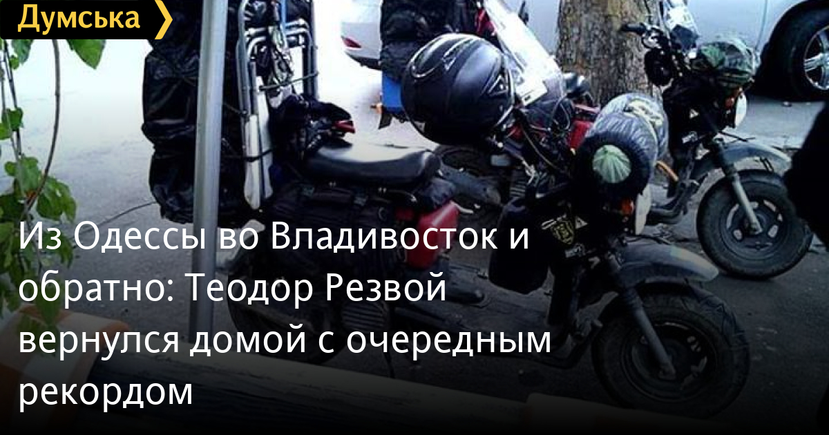 На дырчике Из Одессы во Владивосток и обратно: Теодор Резвой вернулся домой с очередным рекордомОдесские экстремалы Теодор Резвой и Евгений Стоянов, которые пересекли всю Евразию и установили новый рекорд Книги рекордов Гиннеса, совершив самое длинное путешествие на мопедах, вернулись в Одессу. Финишировали они сегодня в 14:30 в том самом кафе на улице Гоголя, откуда стартовали 9 июля. За два с половиной месяца смельчаки преодолели 15 тысяч 265 км («чистыми», сюда не вошли заезды в населенные пункты, пробег по ним и т.п.), что на 2842 километра больше, чем проехал прежний рекордсмен — итальянец Клаудио Терросон, добравшийся на мопеде из болгарского Шумена до Алма-Аты и обратно. «Думская» поздравляет земляков с успешным завершением трудной экспедиции. Фото путешественников СМЕРТЬ РОССИЙСКИМ ОККУПАНТАМ! Заметили ошибку? Выделяйте слова с ошибкой и нажимайте control-enter |