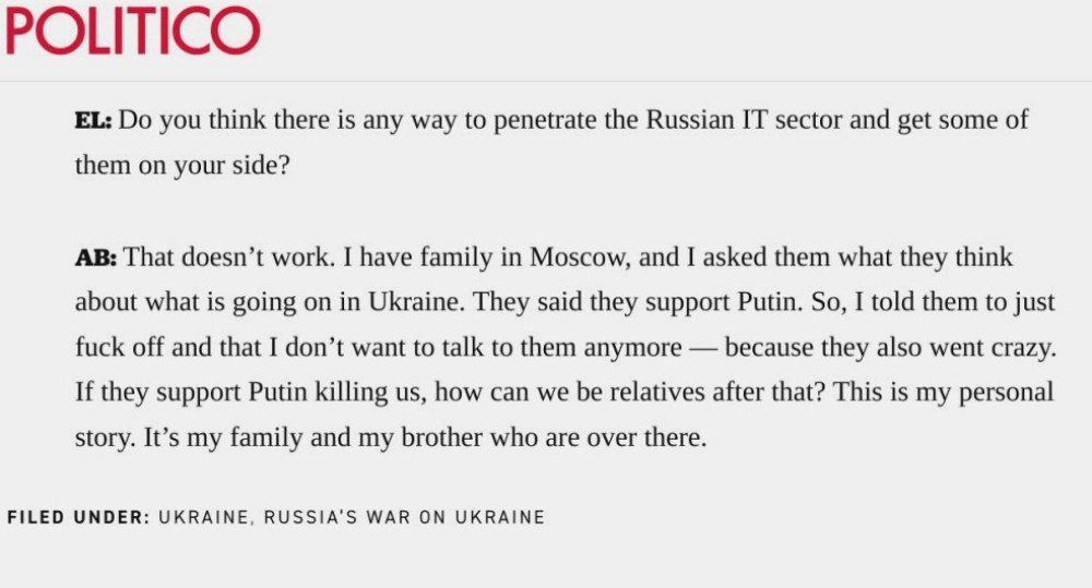 Как выяснилось, российский фейк — результат криворукого перевода российскими пропагандистами фрагмента из интервью, которое заместитель министра дал два дня назад авторитетному американскому изданию Politico. В нем Борняков рассказал о непростых отношениях с живущими в Москве родственниками: после российского вторжения в Украину он разорвал с ними все контакты, потому что они поддерживают Путина.