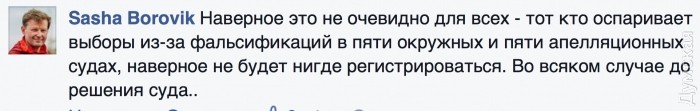 «Наверное это не очевидно для всех — тот, кто оспаривает выборы из-за фальсификаций в пяти окружных комиссиях, наверное, не будет нигде регистрироваться. Во всяком случае, до решения суда», — написал он в Фейсбуке.
