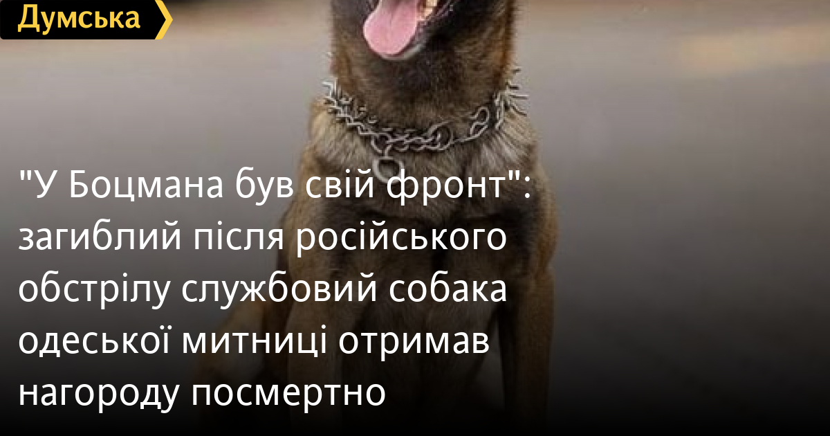 «Такі реалії сьогодення: бойові нагороди загиблих героїв вручають членам їхньої родини. У Боцмана був свій фронт. Він теж загинув на посту. Тільки пост у нього був митний. Свою службу Боцман ніс на поромній переправі в Орлівці. Після однієї з масованих нічних атак пункту пропуску у собаки через стрес відмовили життєво важливі органи», — йдеться в повідомленні.