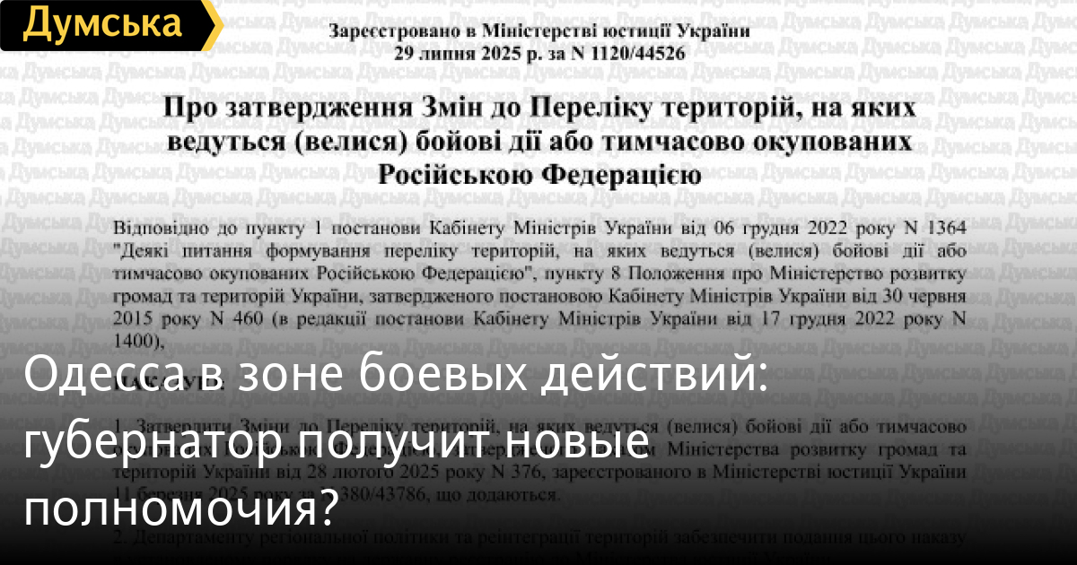 До повного списку увійшли 119 міст і сіл в Одеському, Березовському, Білгород-Дністровському, Болградському, Ізмаїльському, Подільському та Роздільнянському районах. Наказ №1151 підписаний віце-прем'єр-міністром з відновлення Олексієм Кулебою, вже опублікований в «Офіційному віснику України» та набрав чинності з дня публікації. Всі ці громади отримають статус постраждалих від збройної агресії, відповідно до затвердженого переліку. А мешканці — право на державну допомогу, зокрема статус внутрішнього переселенця та соцвиплати. Крім того, через новий статус голова Одеської обласної військової адміністрації Олег Кіпер може отримати розширені повноваження: призупиняти рішення місцевих рад, усувати посадовців, керувати ресурсами громад, зокрема перерозподіляти фінансування та ініціювати перерозподіл коштів місцевих бюджетів, навіть усупереч волі місцевих рад. Про те, як цей процес відбувся в Гостомелі, ми докладно писали тут. Тоді деякі політологи називали таке нововведення наступом на місцеве самоврядування, яке складно буде списати на війну.