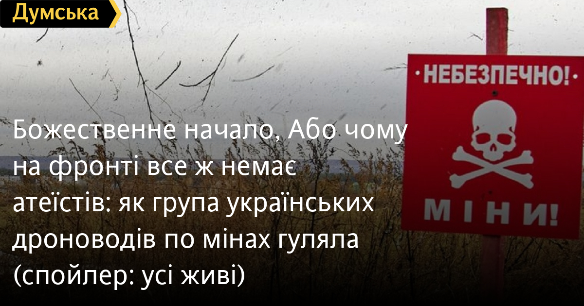 Божественне начало, Або чому на фронті все ж немає атеїстів: як група українських дроноводів по мінах гуляла (спойлер: усі живі)👍 468 🙏 54 ❤ 45 🔥 34 💩 17 😁 10 😢 6 😱 5 & Продовжуємо публікувати фронтові розповіді спеціального кореспондента «Думської» Георгія Ак-Мурзи. Незважаючи на те, що всі новели ґрунтуються на реальних подіях, а в деяких випадках автор був очевидцем і навіть учасником, він продовжує вперто називати нариси «байками». Обережно присутня ненормативна лексика! Кажуть, що на передовій атеїстів немає — коли прилітає багато і жорстко, всі починають згадувати про Бога. Але це не про нас. У нашому підрозділі «Дроно-3,14» віруючих немає. У нас усі атеїсти. Власне, термін «підрозділ» — теж не зовсім вірно. Нас у «Дроно-3,14» всього троє. «Ми» — це наш славний командир, «страшний», тобто старший лейтенант із позивним Маск, він же колишній аспірант Політеху Вовчик, двадцяти чотирьох рочків від народження; головний пілот сержант Махно (позивного йому не давали, прізвища достатньо) віком 26 років. Ну і наймолодший я - помічник пілота, запасний пілот, механік-водій і старший, куди пошлють. Старший солдат, позивний Кайт. Маск, Махно і я в минулому, цивільному житті — випускники однієї альма-матер, славного столичного політеху імені Сікорського. І навіть спеціальність у нас одна — IT. Маск без п'яти хвилин кандидат наук. У цивільному житті таких, як ми, часто кличуть ботанами. Але ми не прості ботани, а бойові: добровольці, класні пілоти дронів, горді винищувачі орків. Еліта Збройних сил! Усе, що відбувається навколо, особовий склад «Дроно 3,14» з огляду на технічну освіту й особливості виховання сприймає з точки зору точних наук — фізики-хімії та інших геометрій з алгебрами. Казочки про банду чуваків, які заблукали в пустелі на сорок років, містика, езотерика та інші міфи народів світу — це не для нас. Мабуть, тому капелани обходять загін стороною, а деякі й зовсім шарахаються. У всякому разі, останнього капелана, православного батюшку, який зарулив у нашу располагу, довелося відпоювати валідолом після диспуту з Маском на тему релігії та божественного. Зовнішній вигляд особового складу «Дроно 3,14», так би мовити, відповідає образу думок. Тату з ніг до голови, тунелі та інші сережки у вухах і бровах, бандани з черепами. Якось на ранковому шикуванні у начальника штабу батальйону, який нас побачив, почала сіпатися повіка. Бравий майор плюнув, вилаявся і дозволив особовому складу «Дроно» з'являтися на ранкові шикування дистанційно. А що робити бідоласі? Ми ж найкращий підрозділ безпілотної розвідки на всю бригаду, на нашому рахунку вже кілька сотень збитих російських мавіків, найкращі показники з розвідки та кілька десятків «задвухсотєнних» окупантів. Але іноді все йде не за правилами точних наук, у які ми віримо. Минулого тижня запустили дрон над позиціями, літаємо. Бойове завдання — розвідка позицій ворога. Махно, головний пілот, керує безпілотником у FPV-окулярах, я на ноуті дивлюся картинку, ставлю геометки. Маск, як годиться головкому «Дроно-3,14», поруч, командує, так би мовити, «битвою», керує особовим складом. Раптом Махно мотає головою, непотрібні слова починає висловлювати вголос. Причому голосно і дуже навіть емоційно. І навіть окуляри здирає! - Заспуфіли дрона, суки! — кричить Махно, — Упав я, блядь, на нейтралі! Перехопили антидроном нашого сок