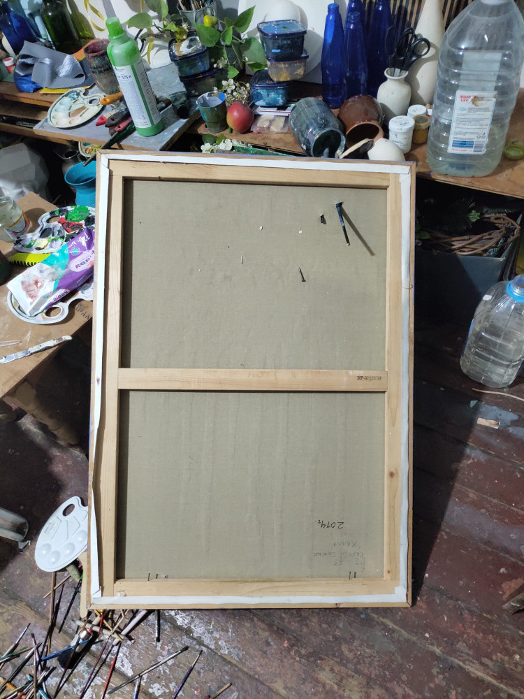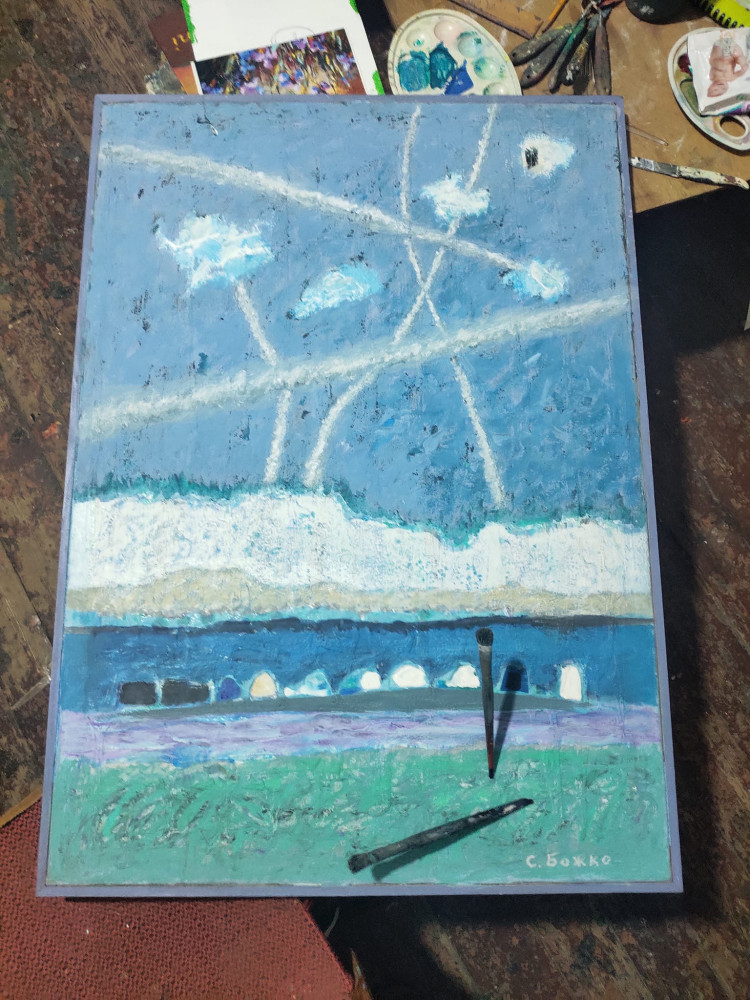 «Лежит моя последняя работа «Зберiгайте спокiй, це працює ППО», а из нее кисти торчат, — рассказал мастер. — Когда над центром города был взрыв, у многих повыбивало окна и Воронцовский дворец пострадал. У меня же со стены упала эта картина на банку с кистями, и вот такая история получилась. Знающие люди говорят, что надо так и оставить в ней эти кисти. Такой современный концепт случайно сам по себе добавился».