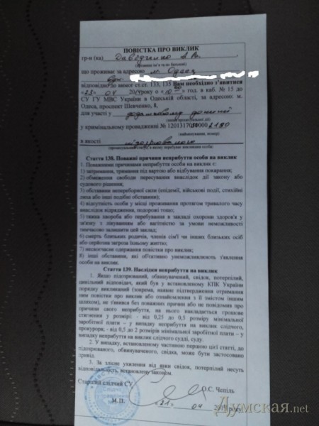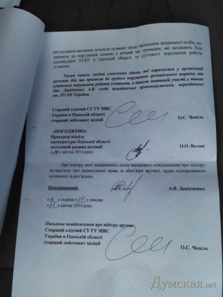 Сегодня милиция уведомила его о подозрении в совершении уголовного преступления, предусмотренного статьей 293 Уголовного Кодекса — «организации групповых действий, приведших к грубому нарушению общественного порядка или существенное нарушение работы транспорта, предприятия, учреждения или организации, а также активное участие в таких действиях».